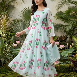 ইন্ডিয়ান জর্জেট থ্রি পিসের মধ্যে আপনি পাচ্ছেন প্রস্তুত করা গ্রাউন, যা আকারে ফ্রি সাইজ থাকায় যে কেউই আরামে পরিধান করতে পারবেন। এই সেটের অংশ হিসেবে একটি ওড়না রয়েছে, যার পাঁচ হাত দৈর্ঘ্য ও সুন্দর লেস দিয়ে কারুকার্য করা। সাথেই থাকছে একটি সালোয়ার, যা তৈরি করা হয়েছে উচ্চমানের বাটার সিল্ক দিয়ে, যা পরিধানে আরামদায়ক এবং দেখতে চমৎকার।