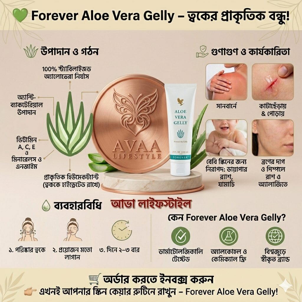 Is your skin feeling dull, dry, or stressed? ত্বকের সব সমস্যা—ব্রণ, দাগ, সানবার্ন বা র্যাশ—সবকিছুর সমাধান এক বোতলেই! AVAA Lifestyle নিয়ে এলো বিশ্বখ্যাত Forever Aloe Vera Gelly, যা ১০০% খাঁটি অ্যালোভেরা দিয়ে তৈরি। 💚