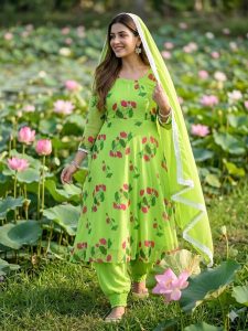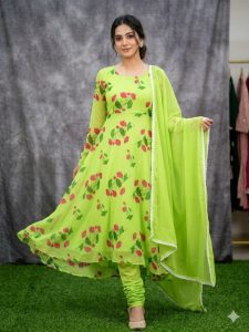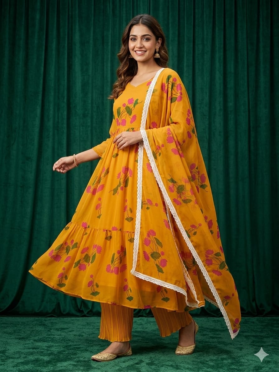 ইন্ডিয়ান জর্জেট থ্রি পিসের মধ্যে আপনি পাচ্ছেন প্রস্তুত করা গ্রাউন, যা আকারে ফ্রি সাইজ থাকায় যে কেউই আরামে পরিধান করতে পারবেন। এই সেটের অংশ হিসেবে একটি ওড়না রয়েছে, যার পাঁচ হাত দৈর্ঘ্য ও সুন্দর লেস দিয়ে কারুকার্য করা। সাথেই থাকছে একটি সালোয়ার, যা তৈরি করা হয়েছে উচ্চমানের বাটার সিল্ক দিয়ে, যা পরিধানে আরামদায়ক এবং দেখতে চমৎকার।