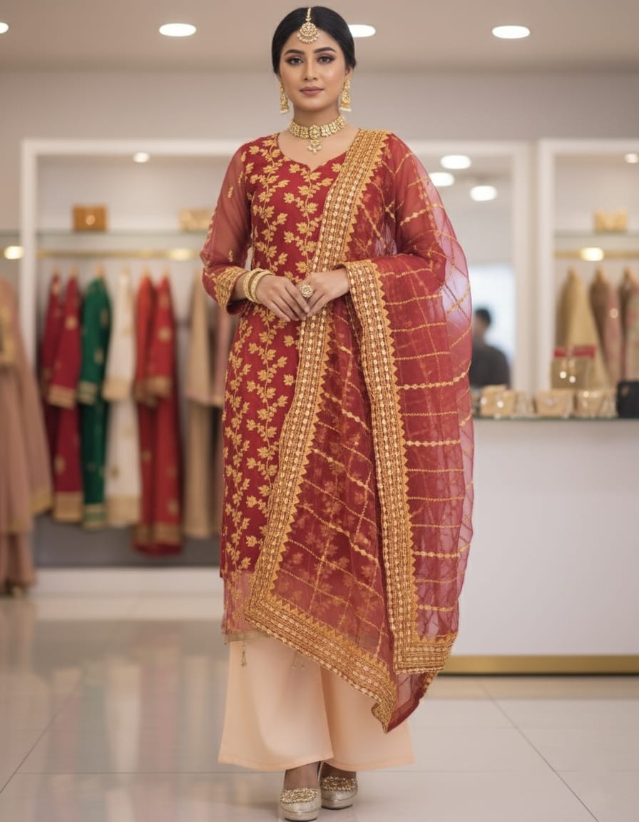 সেমি-স্টিচড অর্গানজা থ্রি-পিস – পার্টি ও ইভেন্টের জন্য পারফেক্ট চয়েস!
